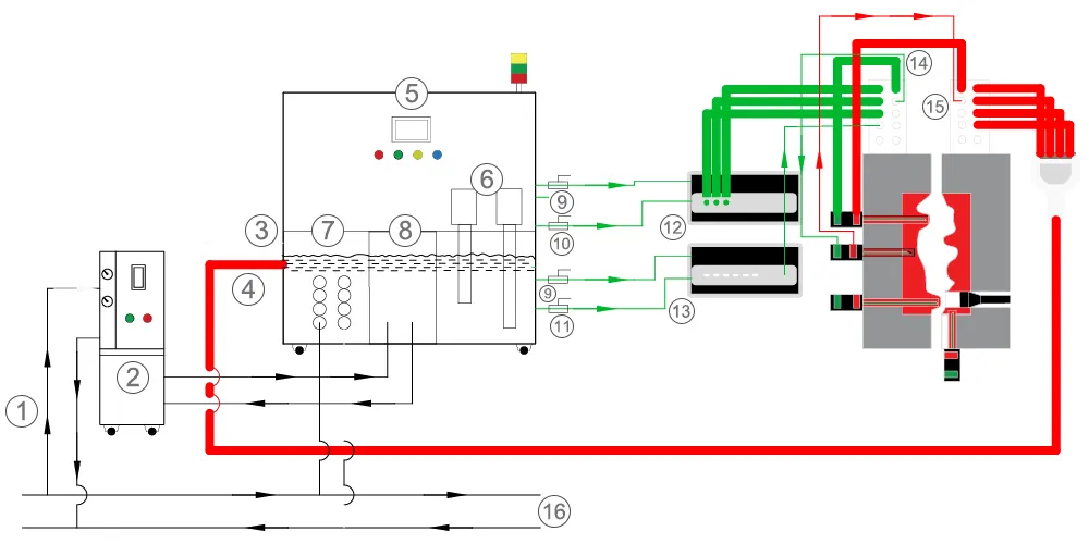 Оборудование поддерживает два различных давления: для точечного (0.6–1.2 МПа) и общего охлаждения пресс-формы (0.4–0.8 МПа).