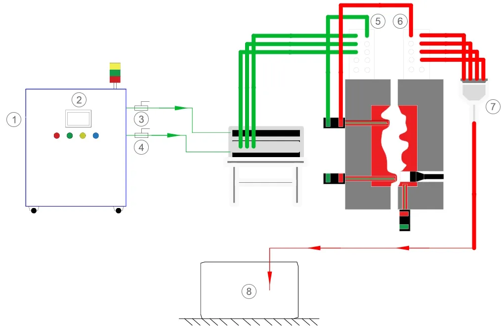 Независимое управление контурами подачи воды и воздуха для удовлетворения потребностей в охлаждении различных зон пресс-формы. Мониторинг расхода в зонах перегрева в реальном времени.